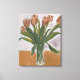 Painting of a bouquet of pink tulips in a clear vase on a stretch canvas
