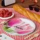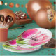Paper plates with a beautiful spring photograph featuring 2 pink tulips and bright green leaves.