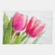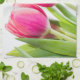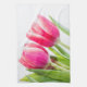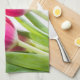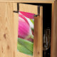Kitchen towel with a beautiful spring photograph featuring 2 pink tulips and bright green leaves.