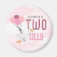 Fun and playful goose themed round magnets for your little one’s big day. This “Two Silly” design features a happy white goose floating with pink balloons against a soft sky background. Personalised with your child's name to make it a perfect match for a silly goose-themed second birthday party. This round magnet makes a simple, easy, ready to go, party favour gift.
