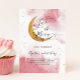 Dreamy girl's 2nd birthday party invitation card featuring watercolor art of pink sky with faux gold moon and stars. The text says "two the moon."