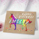 Pink Unicorn Flower Old Paper Girl Happy Birthday Card. Beautiful colourful unicorn with hand-drawn flowers and a name over the unicorn on a beige old paper background. Add your name and message inside or erase it and make a pretty personalised card for a girl.