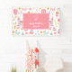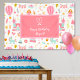 Add a cute custom touch to the birthday party of your little girl with this adorable pink party pattern banner sign. Banner has fun girly items like a unicorn, hot air balloon, doll, balloon, cake, and cupcake. Add a first name with the text Happy Birthday, monogram initial, and heart for a personalised touch.