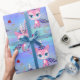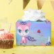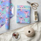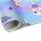 A cute unicorn pattern with little pink unicorns with purple manes and tails, big blue eyes and red, pink and purple hearts scattered all around them. There is also splashes of gold stars and magic, all on a pretty pastel blue and pink background.
