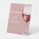 Simple Elegant Pink Vino Before Vows Bridal Shower Cards & Gifts Bridal Shower Pedestal Sign - Perfect for a wine themed bridal shower or wine tasting brunch with the bride to be. This elegant and minimal bridal shower cards and gifts thank you bridal shower pedestal sign features a single wine glass with red wine on a blush pink background. White script and block font add a feminine and romantic feel. Customise this editable bridal shower signage template with your own event details.