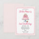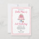 These birthday invitations feature a pink watercolor cake with a ribbon bow tied around it.