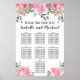 Beautiful pink floral seating chart for a summer or spring wedding. Dark and light rosy pink flowers look beautiful against a variety of greenery. Please find your seat is written in simple and elegant font. The bride and groom names are written below in a romantic script font. It is very easy to edit these and the table lists below.