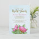 This design features a boho bridal shower invitation, for her the bride to be the perfect summer garden greenery, botanical floral, and elegant calligraphy script, pretty pink peony peonies, and minimalist flowers, a bohemian style, with a blue and blush pink theme, and minimal typography