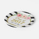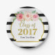 Customisable graduation party class of 2017 plates in classic black and white stripes pattern, pink watercolor vintage flowers, and gold details.