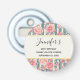 A birthday favour bottle opener with a beautiful pattern featuring pretty pink flowers layered over top a striped pattern composed of blue and cream coloured stripes. A rectangle frame with a faux gold foil border layered over top and your personalised text inside.