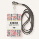 A name tag with a beautiful pattern featuring pretty pink flowers layered over top a striped pattern composed of blue and cream coloured stripes.