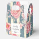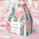 Small favour box with a beautiful pattern featuring pretty pink flowers layered over top a striped pattern composed of blue and cream coloured stripes. A circle frame with a faux gold foil border, with your personalised text inside.