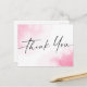Thank you postcard featuring the text "thank you" across the card in an elegant handwritten style script font on a background with pink watercolor splashes