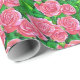 Wrapping paper in a pattern of watercolor roses, in shades of deep fuchsia to pastel pink, against a background of green leaves