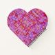 Heart shaped notebook with a pattern of watercolor squares in pinks, red, and purple.
