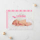 Cute and whimsical baby girl birth announcement with pink and white stripes design for the back of the card.