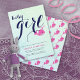 Cute fuchsia pink whale ocean green typography baby girl shower. Adorable fuchsia pink whale swimming in the ocean with navy blue typography for a baby girl shower. The design showcases the words "Baby girl" in a bold navy blue font, accompanied by a sweet pink whale playfully spraying hearts against a soft pale blue backdrop. The back of the invitation is adorned with a charming whale pattern, adding a touch of whimsy to the overall theme.