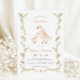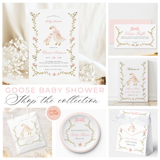 This baby shower invitation design features a cute goose and her mama, and a whimsical watercolor greenery frame design with pink floral elements. Perfect for the trendy goose/duck theme, or backyard garden baby showers.