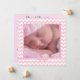 Add your newborn baby's picture to this cute photo birth announcement card. So sweet with the pink and white stripes and white polka dotted bow. On the back of the card you can add all your baby's birth information such as name, birth date, weight and height.
