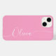 Pink Elegant White Calligraphy Script Custom Personalised Name iPhone 14 Smart Phone Cases features a modern and trendy simple and stylish design with your personalised name in elegant hand written calligraphy script typography on a pink background. Designed by ©Evco Studio www.zazzle.com/store/evcostudio