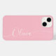 Pink White Elegant Calligraphy Script Custom Personalised Name iPhone 14 Smart Phone Cases features a modern and trendy simple and stylish design with your personalised name in elegant hand written calligraphy script typography on a soft pink background. Designed by ©Evco Studio www.zazzle.com/store/evcostudio