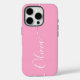 Pink Elegant White Calligraphy Script Custom Personalised Name iPhone 16 Pro Smart Phone Cases features a modern and trendy simple and stylish design with your personalised name in elegant hand written calligraphy script typography on a pink background. Designed by ©Evco Studio www.zazzle.com/store/evcostudio