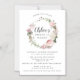 A rustic pink and white floral wreath surrounds your name and Sweet 16 Party. Blush pink roses and white hydrangea flowers nestled in soft green leaves create a beautiful summer wreath. The party information follows below.