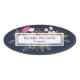 Oval navy blue name tag with a white label atop a bouquet of hand-drawn flowers in pink and white.