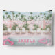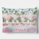 This trendy Poolside zipper pouch features a row of pool loungers with pink and white striped umbrellas set up near a swimming pool. You can personalise with a name. On the back is a repeat of the front design.