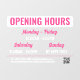 Opening hours window cling with a combo of clean fonts and a retro script in white and pink for an eye catching design so your customers and clients can instantly find your opening hours. Add your contact info as well along with a QR code your customers and clients can scan to access your website and social media. The window cling has a clean and chic design without logo, perfect for your beauty salon, clothing boutique, and more!