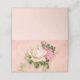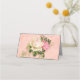 A place card with a floral rose bouquet with white and pink flowers. Background is pink with a floral pattern. Pretty and elegant design.