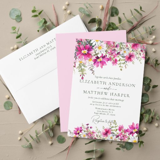 Colourful watercolor wildflowers in magenta pink and white with elegant calligraphy-style script.