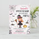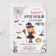 Celebrate Halloween with this Pink Witch Halloween Birthday Invitation! Featuring a charming kid witch in a pink outfit, accompanied by her black cat, bat, spider web, stars, and a glowing moon, this design is perfect for a magical Halloween birthday celebration. The soft pink background adds a playful and whimsical touch, making it ideal for a child's spooky-themed party. BRT131