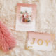 This holiday card features a modern gold foil design. This card reads “joy” on a ombré pink background with foil leaf graphics. The back includes a beautiful wreath border and your own personal photo and message can be added.