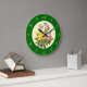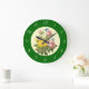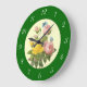 A wall clock with an antique reproduction of pink and yellow roses from vintage botanical artwork by famous artist Pierre Redoute with blue butterflies on a faux parchment background and antique white numbers on an emerald green background. Click Customise It to add your name or message, change background colours and more.