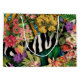 Pretty pink daisies, bright yellow freesias, and dark green palm leaves decorate a wide diagonal band of black and white zebra print and a yellow and turquoise Indian print. The result is a tropical floral collage that will add a dramatic pop of colour.