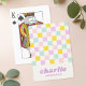 Playing cards featuring a light pink, yellow, purple and aqua blue chequerboard pattern and your name in a retro style, purple font with a line of custom text below. All colours are customisable.