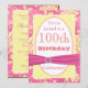 ***PLEASE NOTE that the ribbon and jewels are PRINTED images and are not real on this elegant pink, yellow, and white 100th birthday invitation with large yellow peony or rose type flowers on a distressed look pink background. It is shown here on basic paper, but you can select from a variety of papers that would look nice with this design, such as the linen or metallic ice paper. The invitation is fully customisable, so you can change the numbers to suit any milestone birthday, such as a 50th, 60th, 70th, 80th, 90th birthday, or any number you need. If you require any matching products, such as RSVP cards, postage, envelopes etc., please email niteowlstudio@gmail.com with your request.