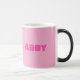 This mug is a pink Morphing Mug. The mug shown is an eleven-ounce mug. The name Abby on the mug can be replaced with another name. You can put your own text on the mug. The name Abby is on both sides of the mug. When you put a hot drink in the mug you can see the image on the mug. You would see the pink background and your text.