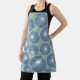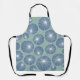 This apron has a mid-century modern design of dusty blue circles with white starbursts inside on a field of seafoam green.