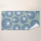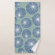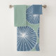 This towel set has a mid-century modern design of dusty blue circles with white starbursts inside on a field of seafoam green.