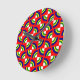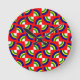 This clock has a Bauhaus design of quarter circles in blue, yellow, green, and white on a field of red.