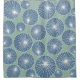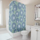 This shower curtain has a mid-century modern design of dusty blue circles with white starbursts inside on a field of seafoam green.