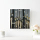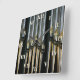 Roman numerals in white lettering on top of silver beaten metal organ pipes, with delicate hues of gold and green reflected in the metal. This is a version for a square clock.