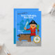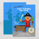 Calling all mates for a pirate party adventure. Celebrate your little pirate’s birthday with this colourful and modern invitation, featuring the pirate captain with his friend parrot. He's preparing to sail, his ship is waiting. The background features a ship silhouette in blue tones. This card is perfect for a boy's pirate-themed birthday, walk the plank pirate birthday, talk like a pirate day, and more. It’s easy to personalise this party invitation with your own details.