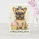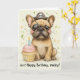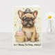 Adorable French Bulldog dressed as a swashbuckling pirate with skull and crossbones hat and eye patch, celebrating with a pink frosted cupcake and lit candle against a festive confetti background. This charming illustration features the text "Arr! Happy Birthday, matey!" perfect for birthday celebrations and dog lovers. generativecontent.