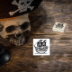 A charming black and white illustration of a pirate ship, complete with skull and crossbones on its sails and flags. The ship features detailed line art, showcasing its hull, masts, and portholes. This stamp perfectly embodies the adventurous and rebellious spirit of pirate tales.
