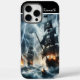 A pirate ship battles a violent storm with lightning flashing in the sky. The ship sails through treacherous waves as a small boat navigates the tumultuous water.