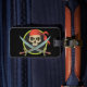 Thar be pirates. Design is a skull with green eyes, head bandanna and crossed swords. Great for "Talk like a Pirate Day" on September 19.