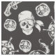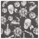 White graphics of skulls & pirate elements on black background, seamless repeat pattern